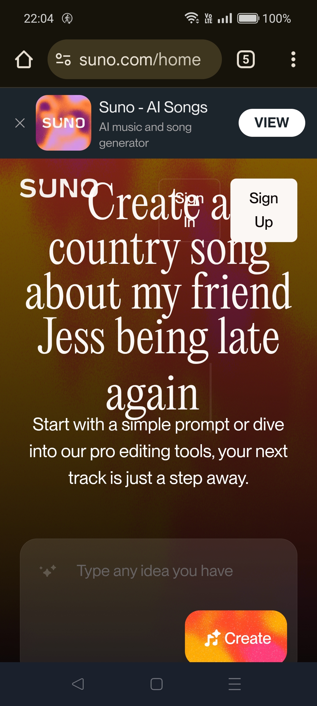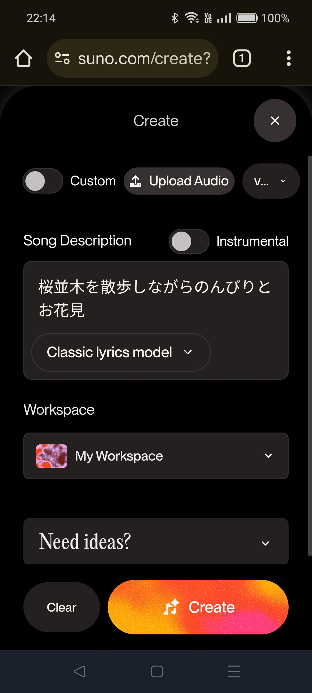 Sunoは簡単な文章で指示することで作曲してくれるサービスです。ページは英語ですが、日本語の文章でも曲がつくれます。英語が苦手な方はアプリをインストールすれば日本語が表示されます。本書ではWeb版で説明します。