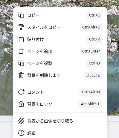 背景の写真を右クリックして「背景から画像を切り取る」を選択します