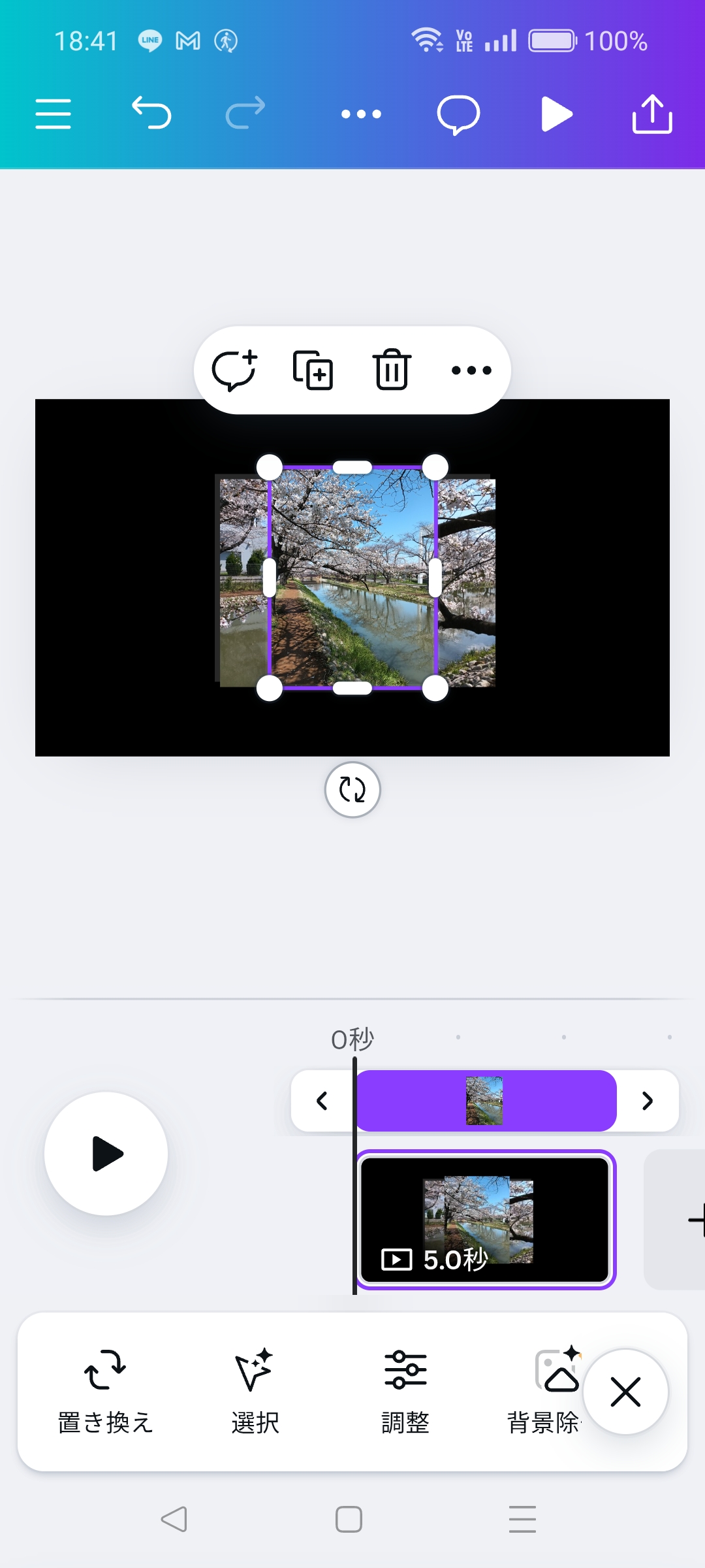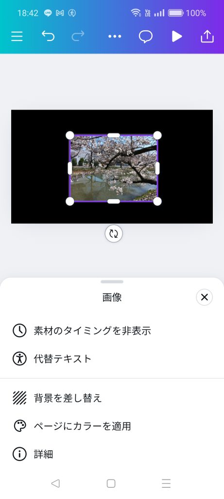ツールバーの右端の「…」を選択して上にスライドして「背景を差し替え」を選択すると写真がキャンバスと同じサイズになります。