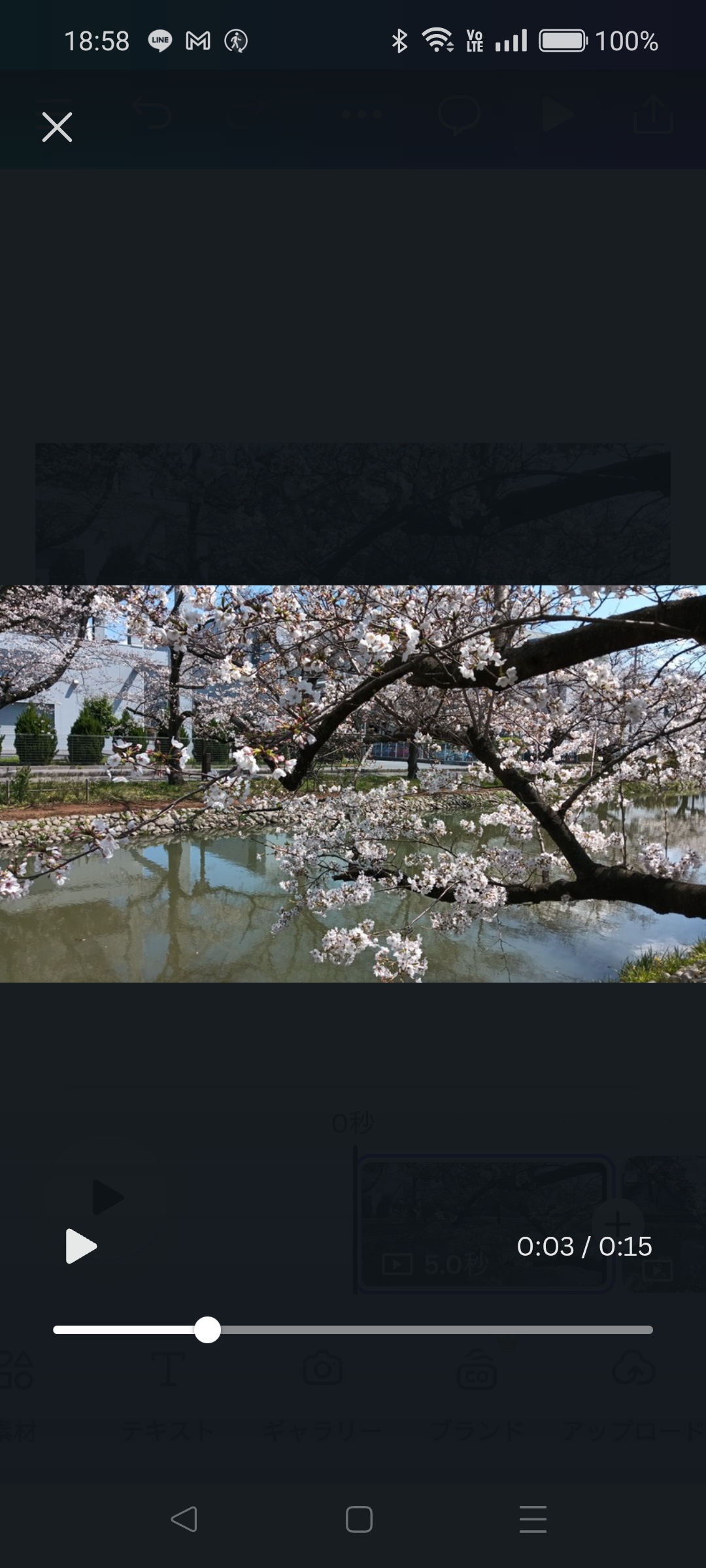 何枚か写真を追加したら右上の再生ボタンを押してみましょう。5秒おきに写真が切り替わる動画が再生されます。左上の✕ボタンで編集画面に戻れます。