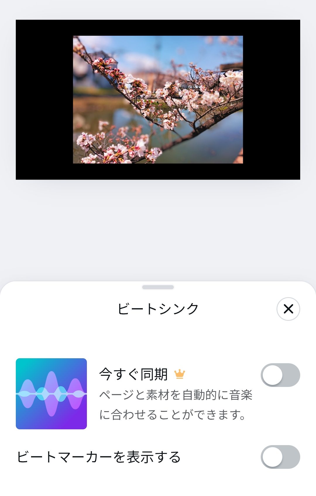 ビートマーカを表示するをONにすることで、曲の区切りがタイムライン上にマーカーで表示されます。写真の切り替わるタイミングを曲に合わせるのに便利です。