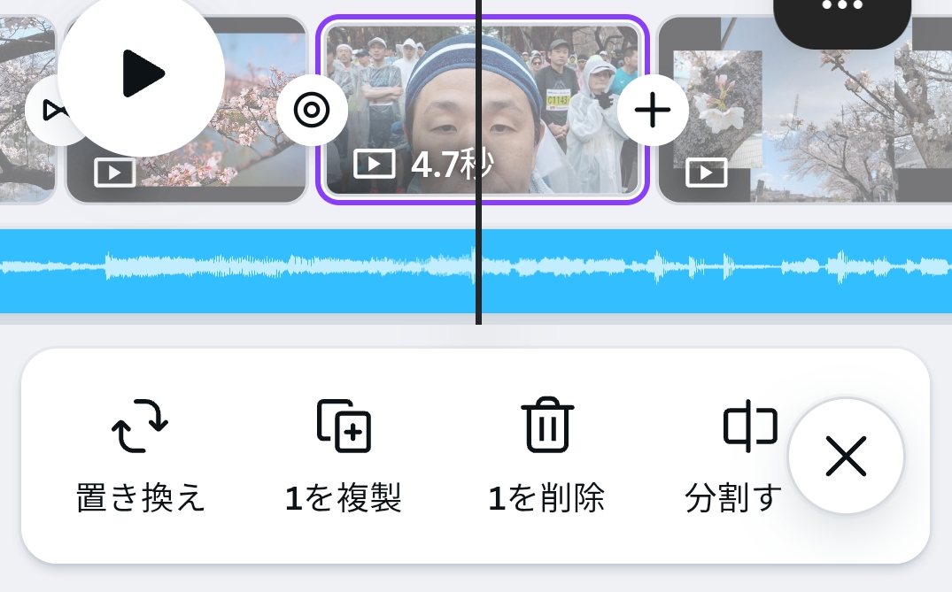 「分割する」をタップすると曲を分割できます。分割することで、ドラッグして曲を止める間隔を作ったり、一方を削除して曲の一部を削除することができます。