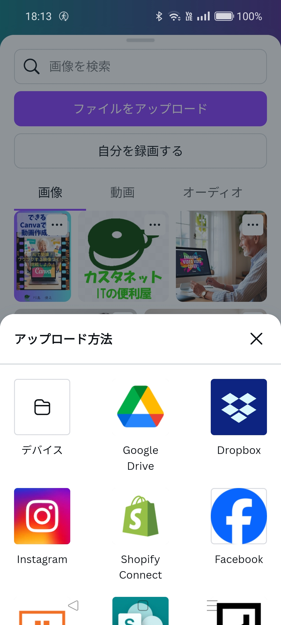 - Canvaのメインメニューのアップロードをクリック
