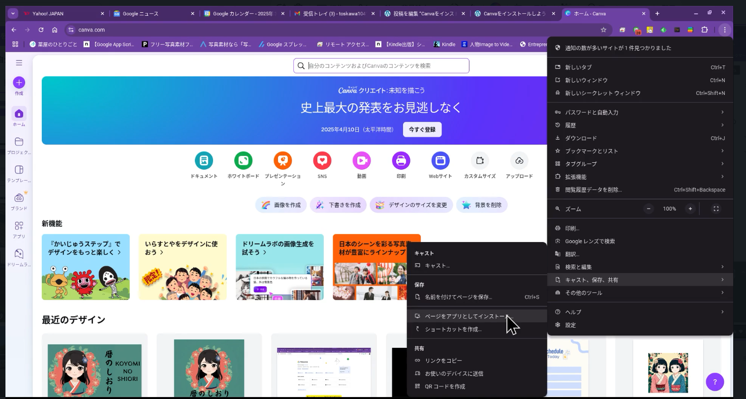 CanvaはWebアプリ(Webブラウザ上で動くアプリ)です。インストールしなくても、canva.comにアクセスするだけで使えますが、他のアプリと同じようにスタートメニューやデスクトップから起動できるようにアプリとしてインストールしましょう。